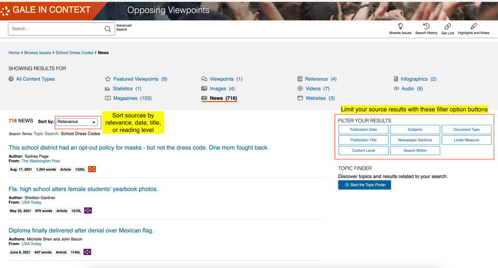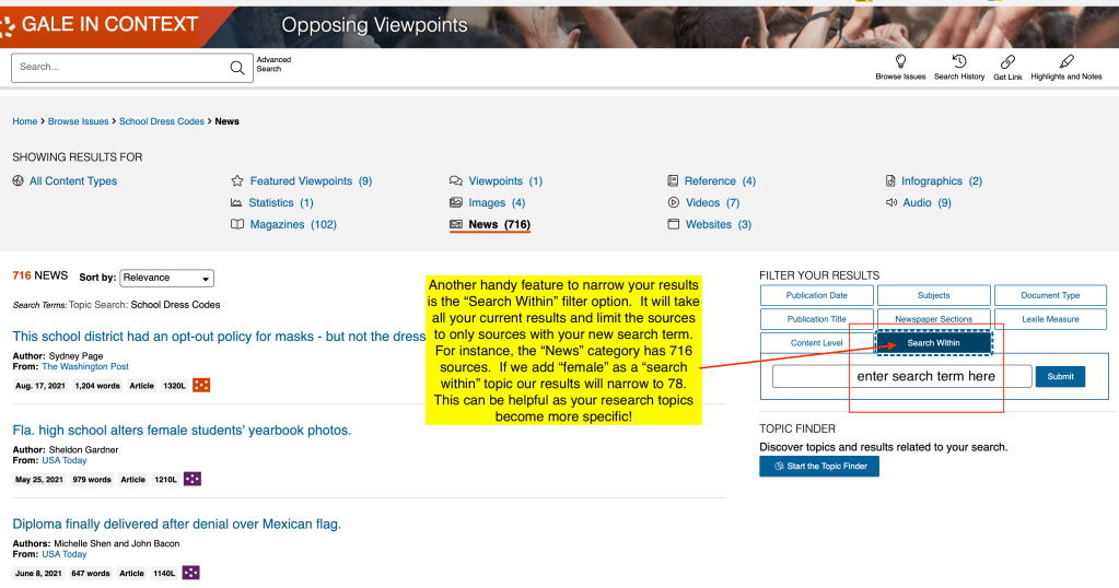 You can also search for a specific topic within your sources. For example, there are 716 news articles about School Dress Codes. If I know that I am researching how female students are impacted specifically I can use the “search within” option in the right sidebar. Entering “female” will limit my results to only articles about School Dress Codes that ALSO contain the word “female.” In this example that reduces my number of articles to 78– which is much more manageable. See screenshot below: