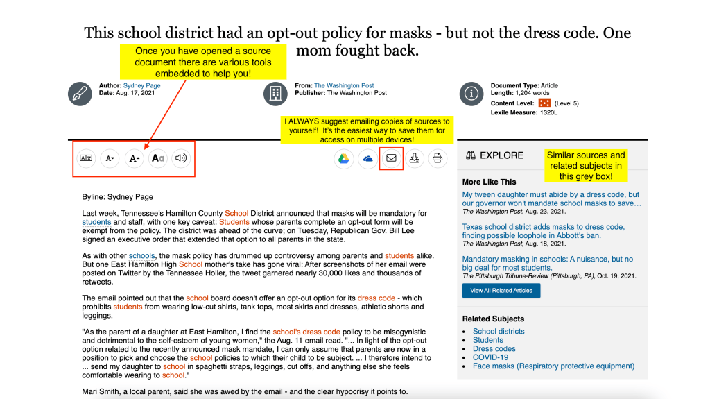 Once you have opened a topic (in this screenshot example: School Dress Codes) this database displays resources related to that topic. I generally suggest starting with the “Read More” in the topic homepage.
