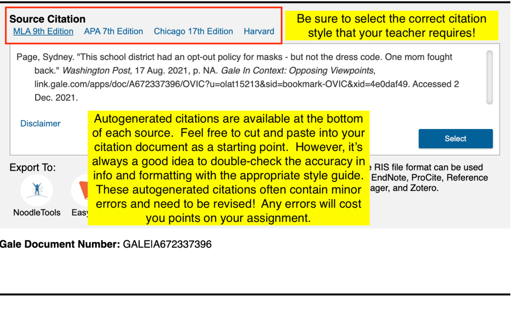 The database will autogenerate source citations at the bottom of each source. You will need to make sure you select the correct style guide (MLA, APA, etc) that your teacher requires. Additionally, these citations are NOT checked by real humans! This means they are a great starting point, but to ensure accuracy you should check the autogenerated citation against the style guide to fix an errors in information or formatting.