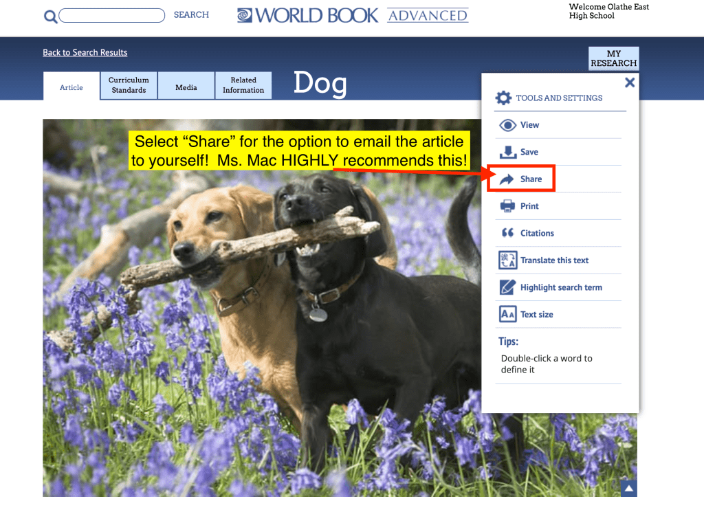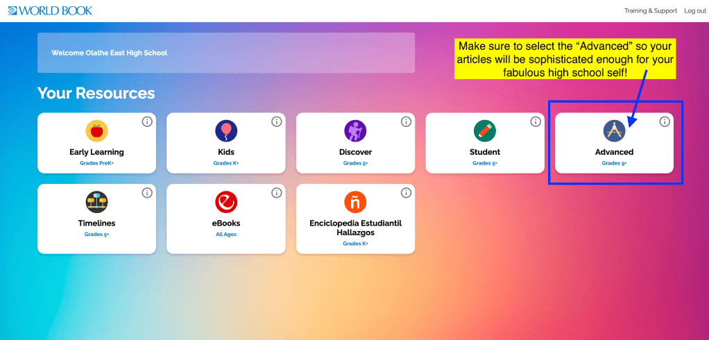 When accessing World Book Advanced from OFF-CAMPUS you will need to enter the Olathe East student password, located in the PASSWORD link below. If you have forgotten the password to open the link, stop by the library or email Ms. McNerney, smcnerneyoe@olatheschools.org. Click here for a video tutorial of the passwords page.