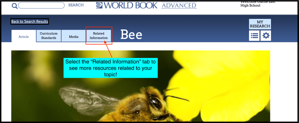 When you find a useful article it is a good idea to also click the “Related” tab at the top of the page. Often the encyclopedia will suggest articles you may not have thought to search for directly (like “beekeeping” when you are researching “bees). These articles can often help you expand your research and add details to your information.